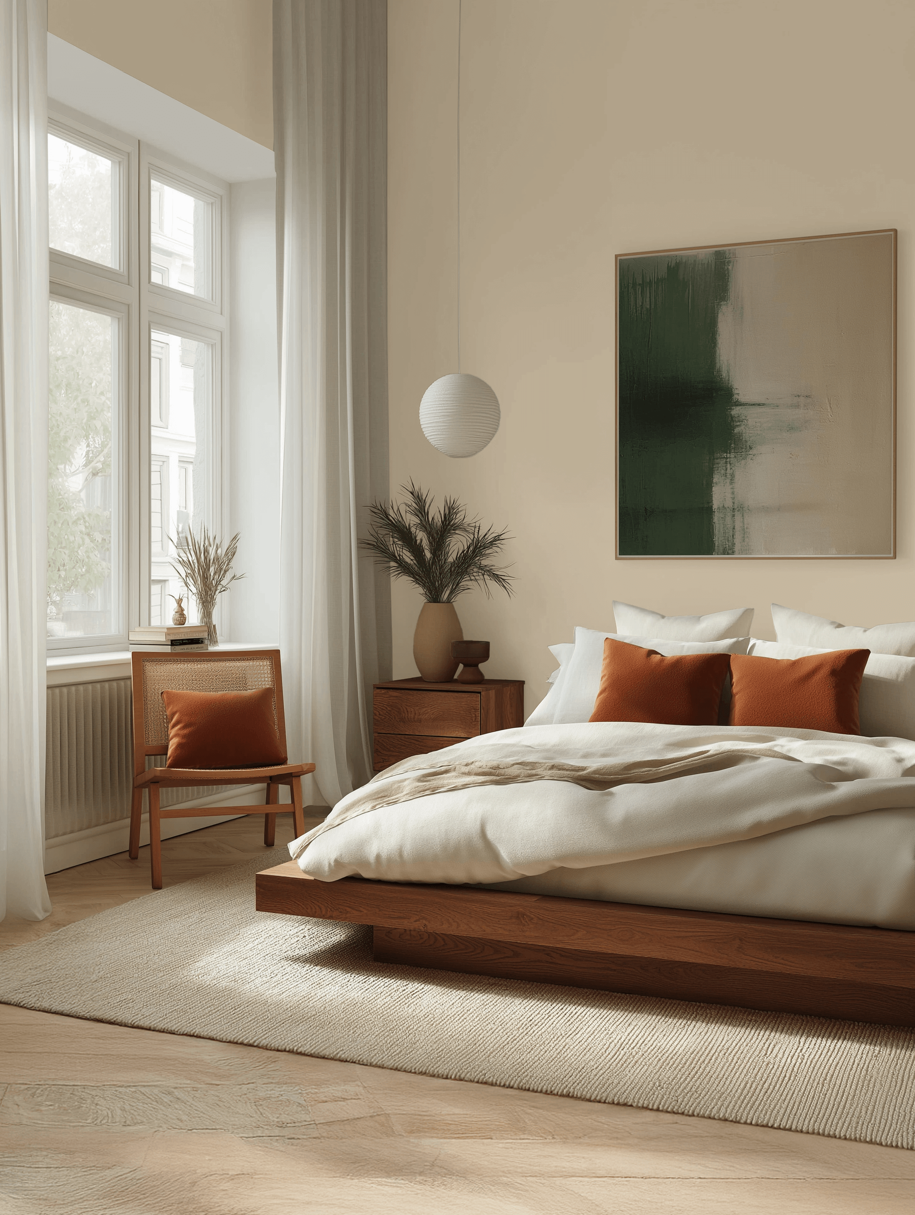 Beginne mit einer hellen, neutralen Wandfarbe (Weiß, Greige, Beige). Setze gezielte Akzente mit einer einzelnen Wand in einem gedeckten Farbton, einer skandinavischen Tapete oder einer DIY-Bilderwand. Kombiniere natürliche Materialien und klare Formen bei Möbeln und Deko dazu. So schaffst du mit wenig Aufwand eine große Wirkung.