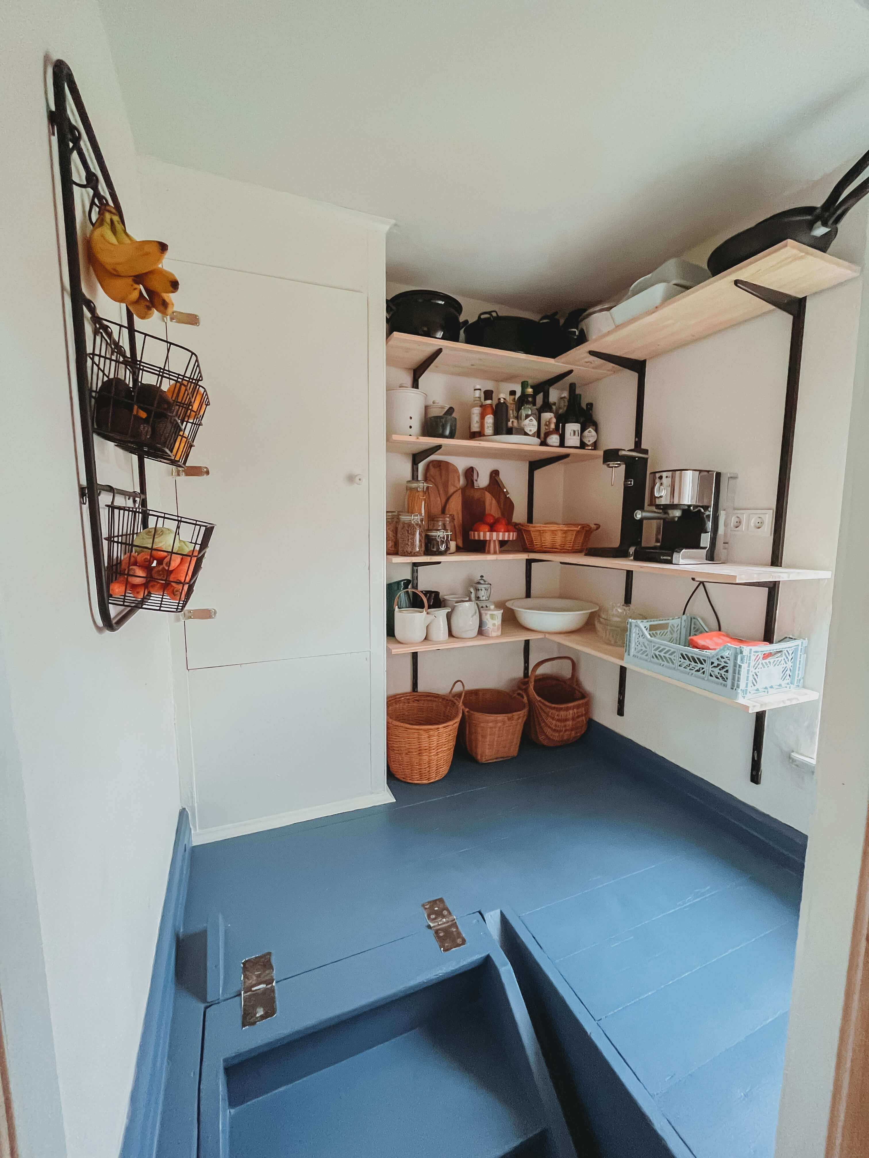 Die Waschküche ist in „Gelb mit Sonne” gestrichen, dazu haben wir an Fenstern und Türen ein Hellblau kombiniert. Ich liebe die zwei Farben zusammen.